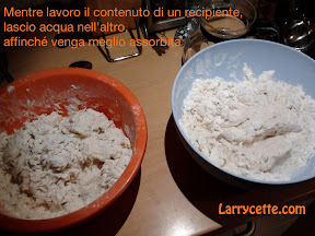 Io ho impastato due chili di farina con un litro e mezzo scarso di acqua, ma ho lavorato in due recipienti distinti per comodità.